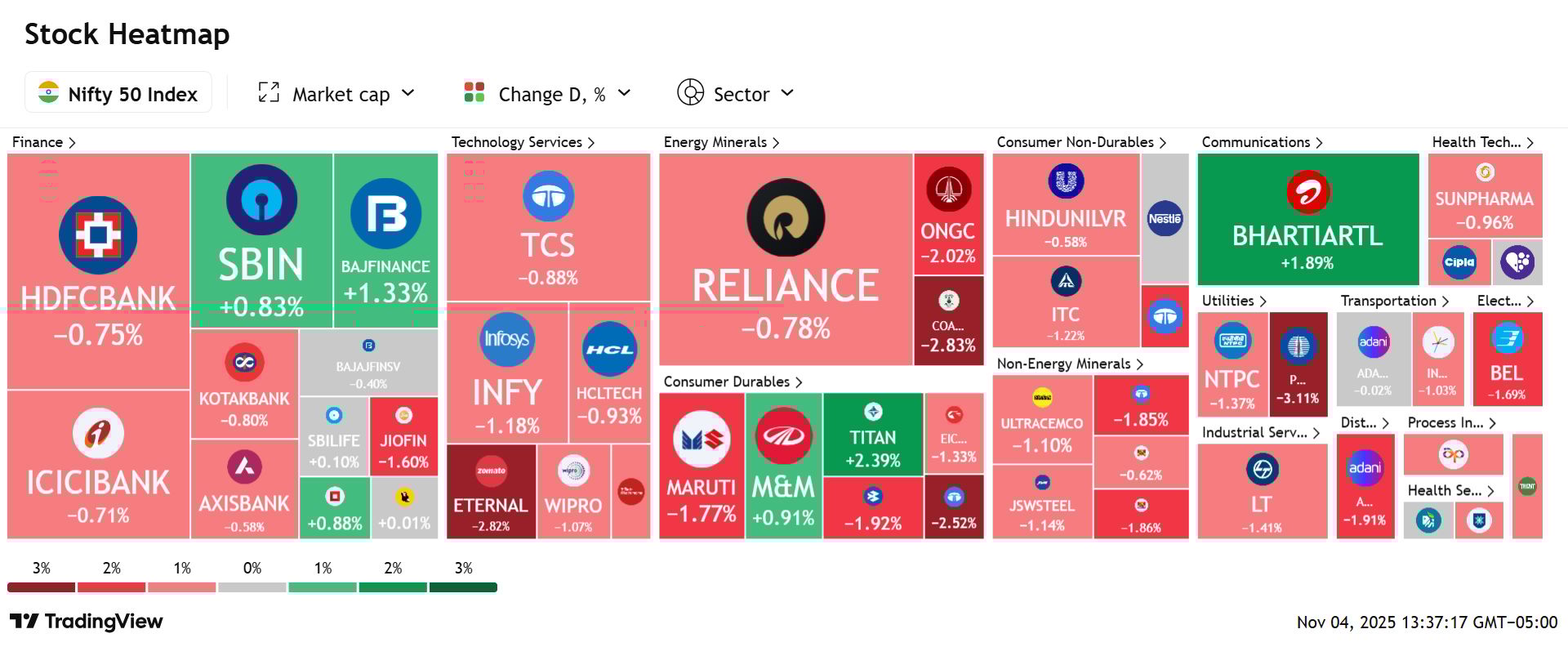 On November 04, Indian equities slipped as profit-taking in IT and autos overpowered strength in telecom and consumer names. Sensex closed 83,459.15 (-519.34, -0.62%) and Nifty 50 25,597.65 (-165.70, -0.64%). Nifty Midcap 100 60,037.20 (-0.42%) and Nifty Smallcap 100 18,360.90 (-0.82%). India VIX eased to 12.65 (-0.16%). Momentum cooled after October’s rally while flows stayed domestically supported.