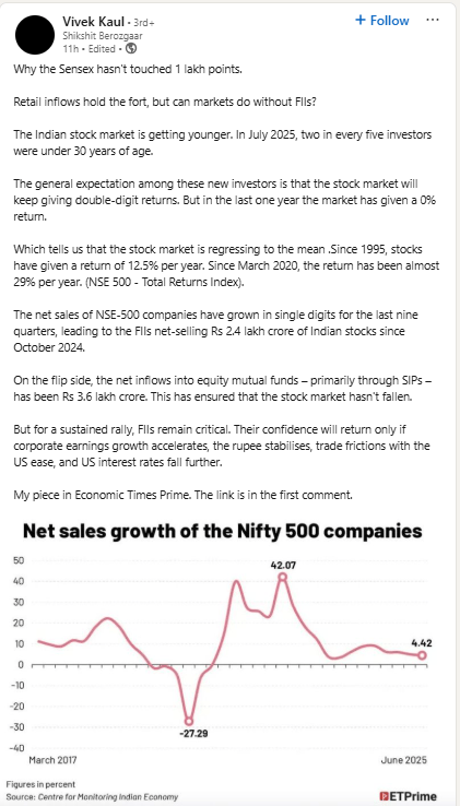 Sector rotation: FMCG, Realty, IT lagged; PSU Banks, Metals outperformed; broader mid/small caps underperformed.