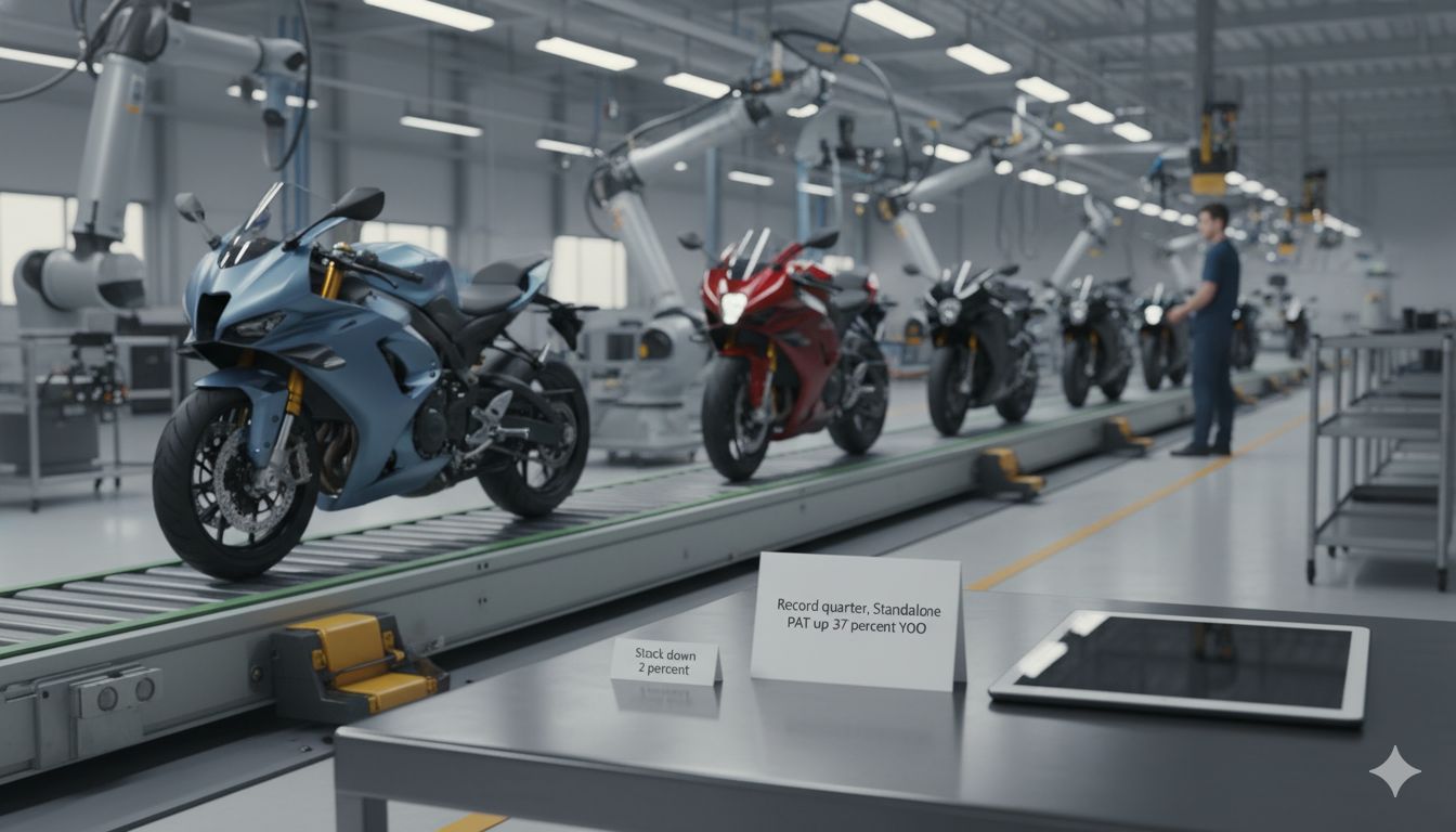 TVS Motor: Record quarter, soft close. Standalone PAT +37% YoY; stock eased 2% on profit-taking.