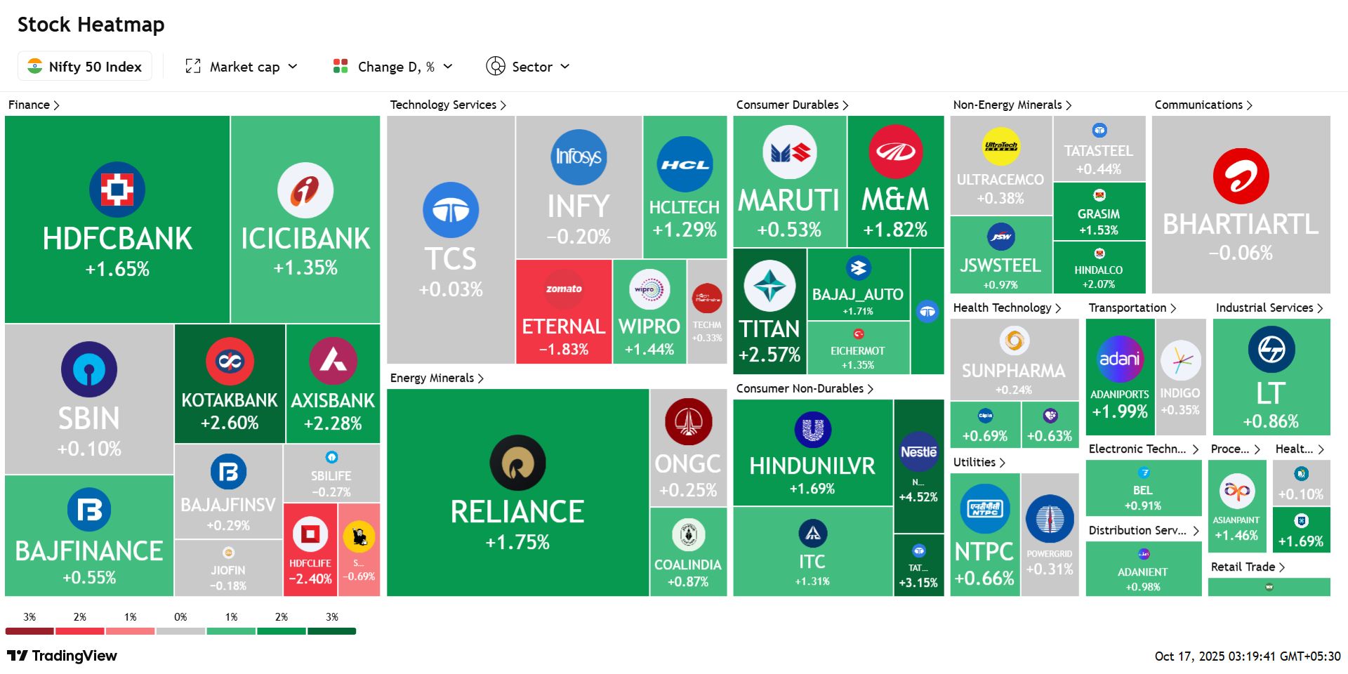 On October 16, 2025, Bulls pressed on for a second day, as banks/FMCG led, and a firmer rupee eased macroeconomic nerves. Sensex closed 83,467.66 (+862.23, +1.04%); Nifty 50 25,585.30 (+261.75, +1.03%). Broader indices rose: Nifty Midcap 100 +0.46%; Nifty Smallcap 100 +0.24%, India VIX 10.86 (▲3.13%). Provisional flows were supportive: FII +₹997 cr; DII +₹4,076 cr.