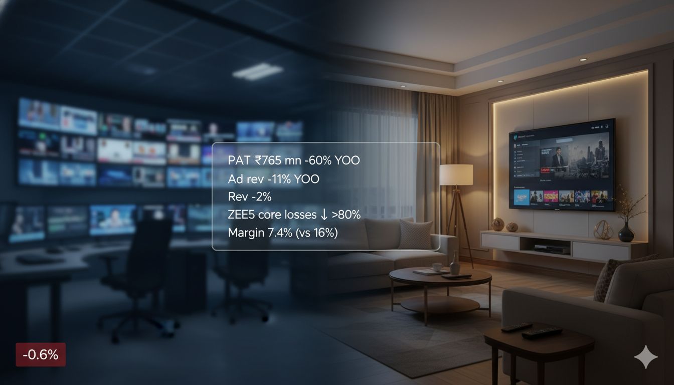 Strategic/ops: ZEE5 core losses cut >80%; subscription +5%; margins compressed 7.4% vs 16% YoY.