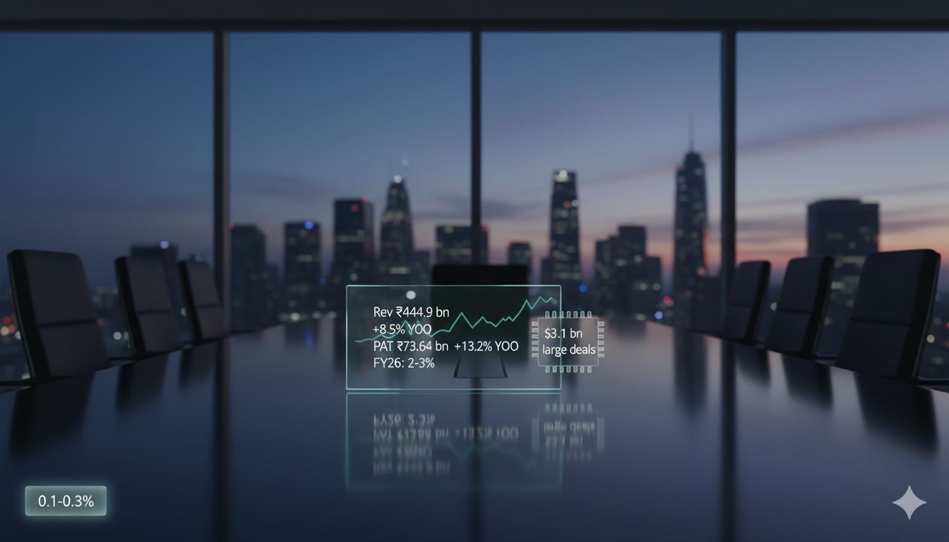 Financial performance: Q2 revenue ₹444.9 bn (+8.5% YoY); PAT ₹73.64 bn (+13.2% YoY), both ahead of estimates. Guidance tightened to 2-3%.