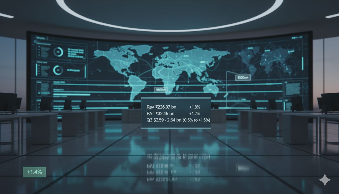 Financial performance: Revenue ₹226.97 bn (+1.8% YoY); PAT ₹32.46 bn (+1.2% YoY). Q3 guide $2.59-2.64 bn (-0.5% to +1.5% QoQ).