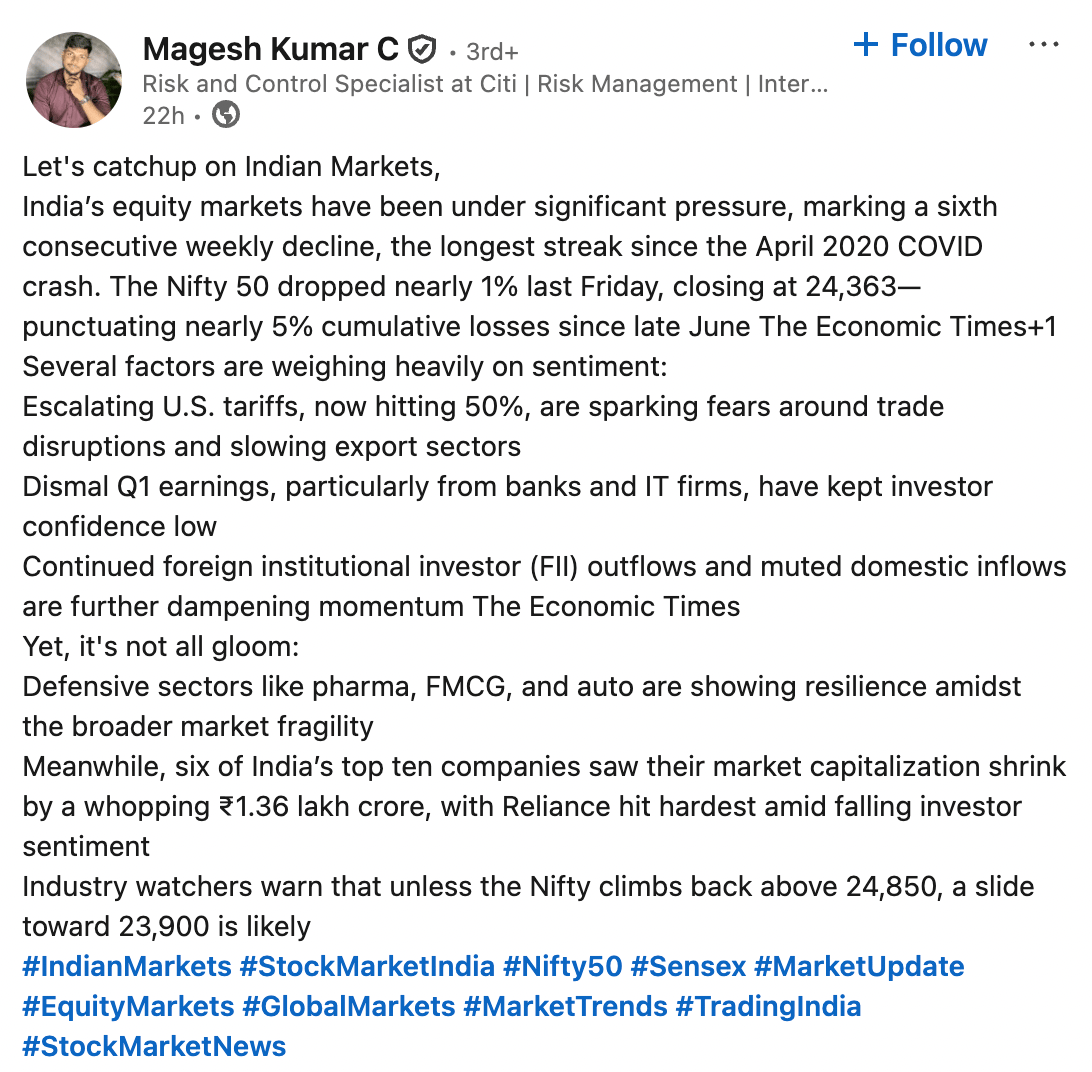 Pipeline volatility from oil and rupee swings: Crude price fluctuations remain a key macro risk, given India’s heavy import dependence—any spike tightens the current account and pressures the rupee.