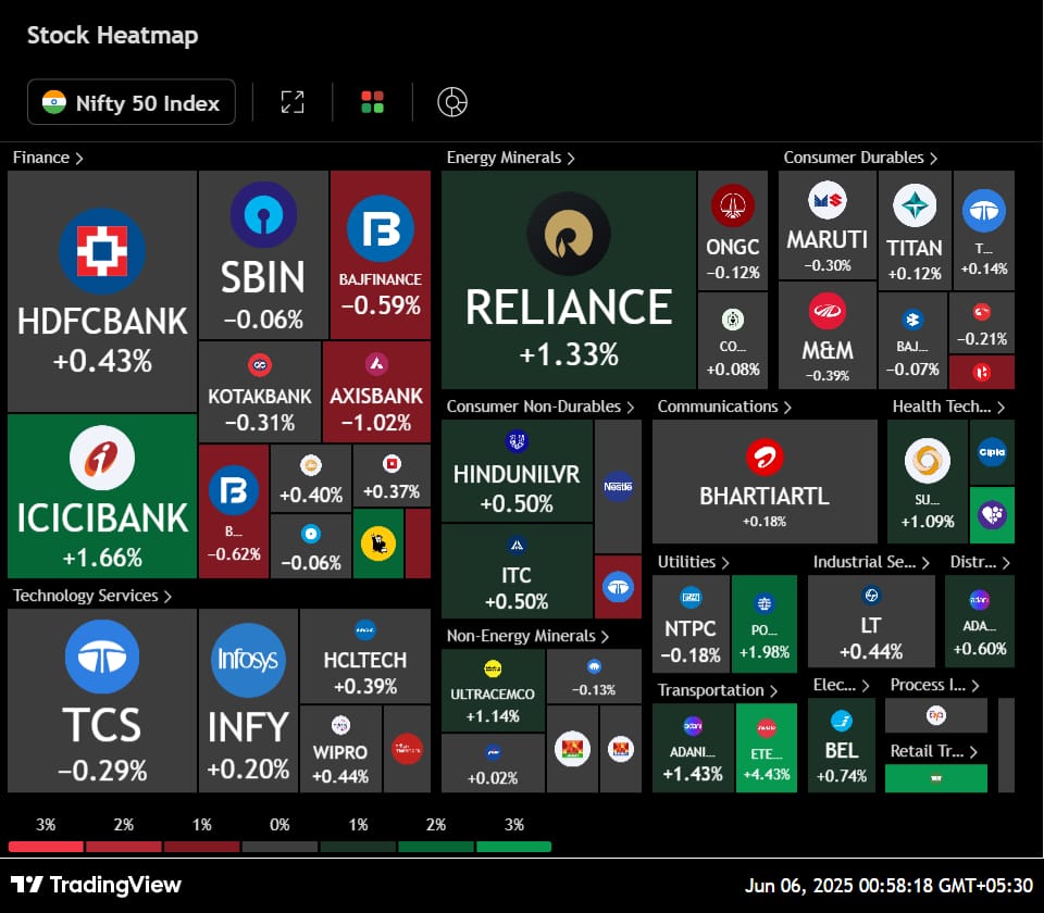 On June 5, 2025, Indian equity markets extended their gains for the second consecutive session. The BSE Sensex rose by 443.79 points (0.55%) to close at 81,442.04, while the NSE Nifty 50 advanced 130.70 points (0.53%) to settle at 24,750.90.