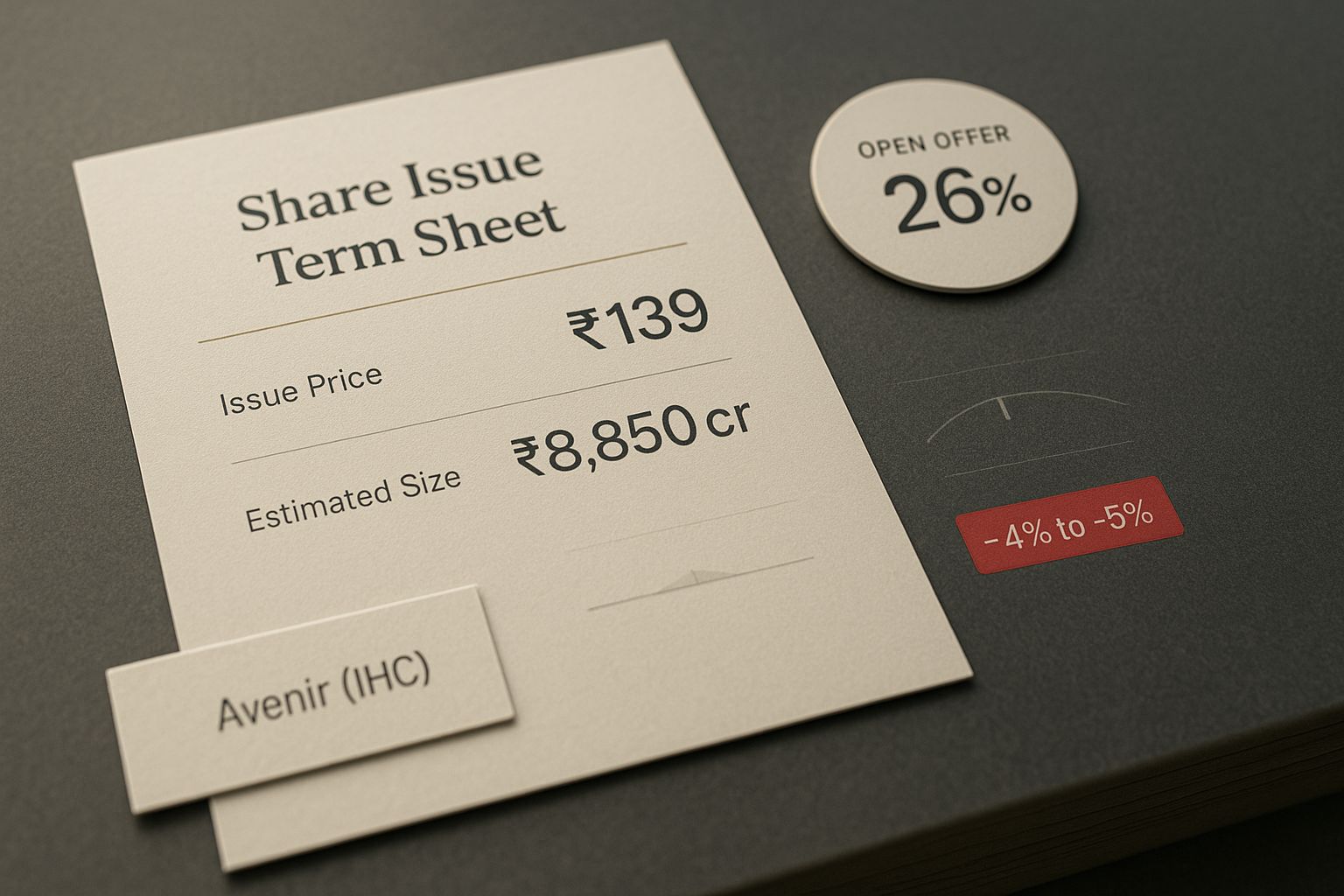 Deal terms: IHC affiliate Avenir to take 330 mn shares + 306.7 mn warrants at ₹139; 26% open offer triggered per regulations.