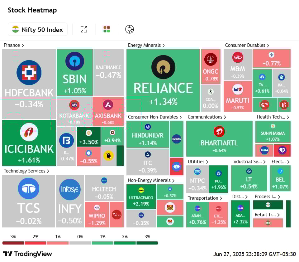 On June 27, 2025, Indian equity markets extended their winning streak for the fourth consecutive session, buoyed by strong buying in financial and metal stocks amid easing global risks and the return of foreign inflows. The BSE Sensex advanced 303 points (+0.36%) to close at 84,058.90, while the NSE Nifty 50 climbed 88.80 points (+0.35%) to end at 25,637.80, reclaiming the 25,600 level. The upbeat market sentiment also supported the Indian rupee, which strengthened by about 21 paise to settle at ₹85.49 against the U.S. dollar.