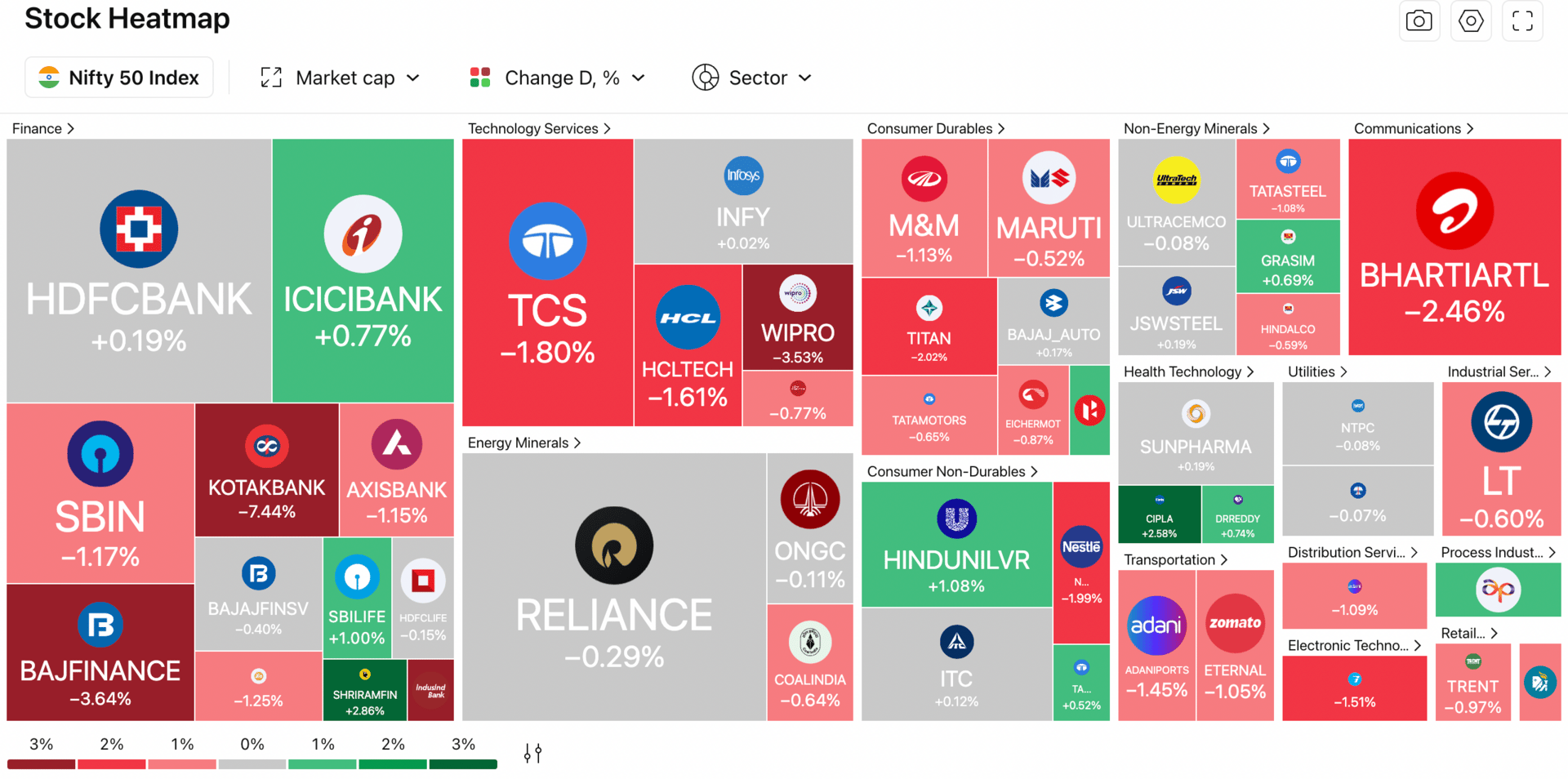 Banking Drag: Weak Q1 results from Kotak Mahindra Bank and IndusInd Bank weighed heavily on financial indices, with both stocks falling sharply after earnings misses.