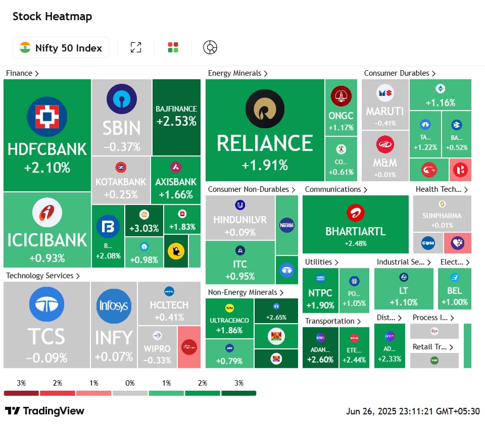 On June 26, 2025, Indian equity markets surged for a third straight session, with the BSE Sensex soaring 1,000.36 points (1.21%) to close at 83,755.87 and the NSE Nifty 50 rallying 304.25 points (1.21%) to settle at 25,549.00, crossing the 25,500 mark for the first time this year. The rally was broad-based, led by strong gains in financials, metals, and energy stocks, while private banks and oil & gas sectors also outperformed. The Nifty Bank index hit a new all-time high, surging over 600 points, and investor wealth rose by ₹3.42 lakh crore to ₹457.44 lakh crore. The positive sentiment was driven by a ceasefire between Israel and Iran, which eased geopolitical concerns, and a sharp drop in crude oil prices (Brent crude fell from $79.40 to $66.76 per barrel, down over 15% in three days). Foreign institutional investors remained cautious due to narrowing US-India yield spreads, but domestic institutions continued to buy, buoyed by improving liquidity and domestic consumption.