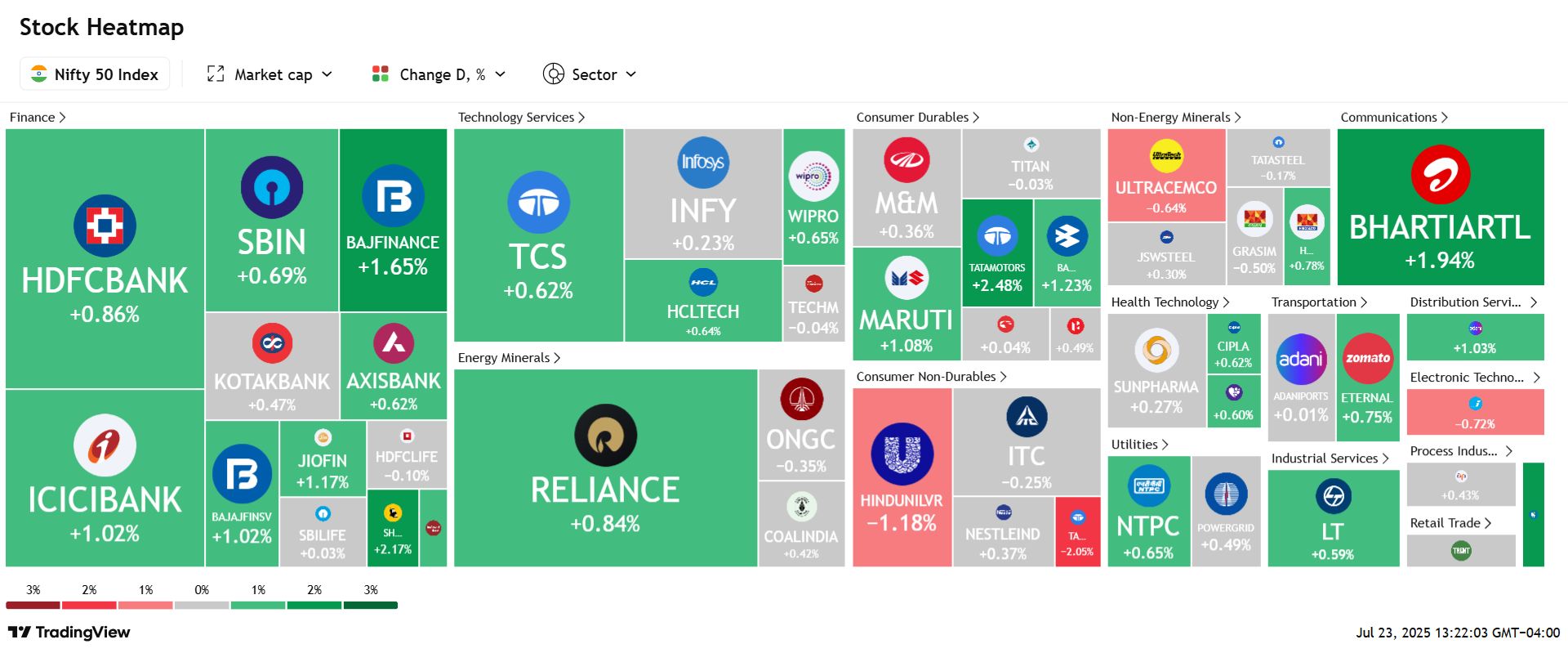 On July 23, 2025, Indian equity markets posted strong gains, tracking positive global cues and robust Q1 earnings from key corporates. The BSE Sensex rallied 539.83 points (0.66%) to close at 82,726.64, while the NSE Nifty 50 climbed 159 points (0.63%) to settle at 25,219.90. Broader market performance was mixed, with the Nifty Midcap 100 rising 0.34% and the Nifty Smallcap 100 finishing flat. Sectoral gains were led by auto, financials, and metals, while realty stocks declined. Investor sentiment improved on global optimism and upbeat earnings, although some caution persisted on trade policy developments and the ongoing earnings season.