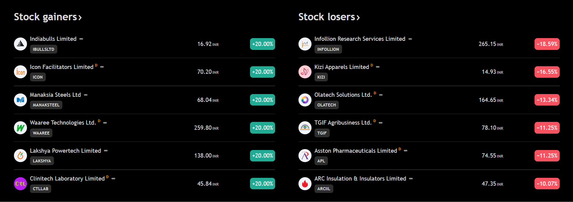 Top Gainers & Losers